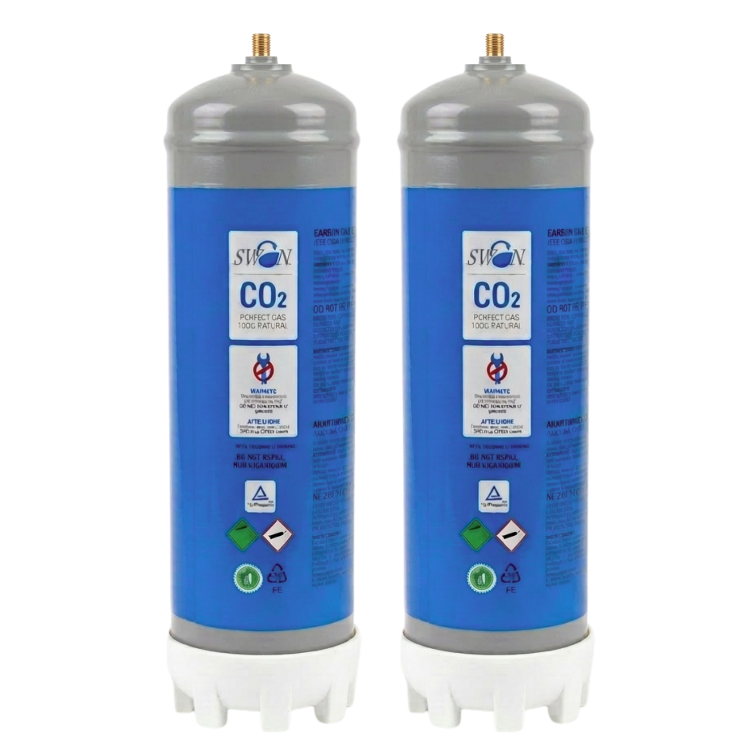 Kit di 2 bombole CO₂ alimentare da 1.200 g monouso per gasatori domestici, con attacco standard M11x1 per una connessione semplice e sicura.
